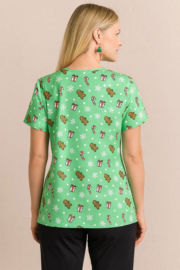 Gingerbread Christmas Scrub Top – Green Holiday Medical Uniform with Candy Cane & Gift Print | Festive Scrubs for Nurses & Doctors