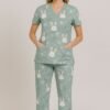 Mint Bunny ComfortFit Medical Scrub Set – Soft Fabric, Cute Pastel Print, V-Neck Top & Matching Pant