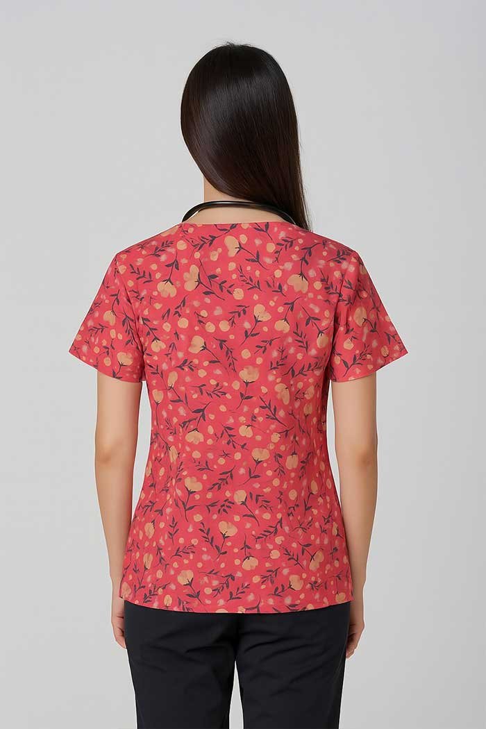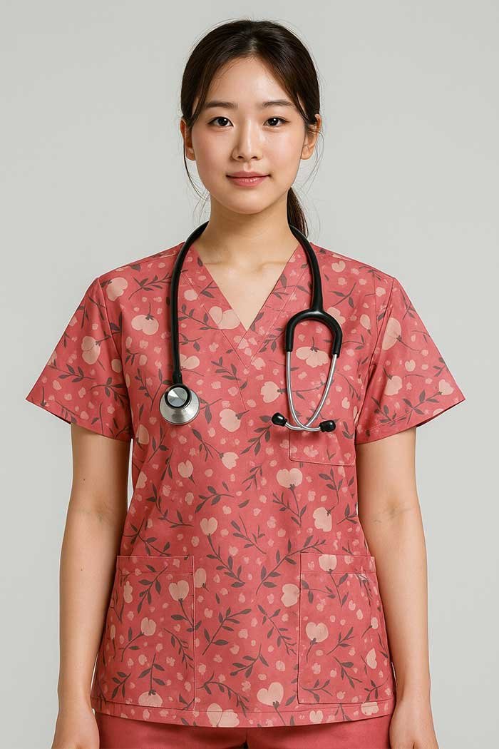 Peach floral scrub top on a coral base, crafted in 100% breathable cotton. Features a V-neckline, 3 roomy pockets, and relaxed fit – perfect for healthcare professionals.