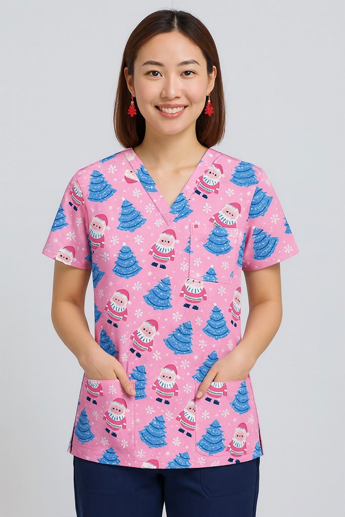 Crafted from high-quality, breathable, and easy-care fabric, this unisex V-neck scrub top ensures lasting comfort through long shifts. Its functional pockets provide practical storage for everyday essentials, while the festive design keeps you looking merry and professional.