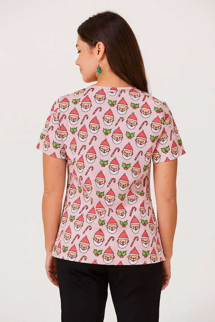 Featuring an adorable pattern of Santa faces, candy canes, and holly leaves on a charming pink background, this scrub top adds fun and positivity to every shift.