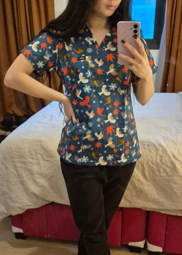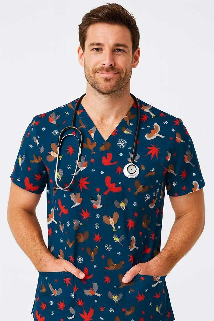 Step into the season with flair and function in the South for the Winter Scrub Top – a stunning print featuring migratory birds, maple leaves, and snowflakes against a deep winter-blue background. Whether you’re working in a hospital or clinic, this top brings a warm touch of nature-inspired design to your professional wear.
