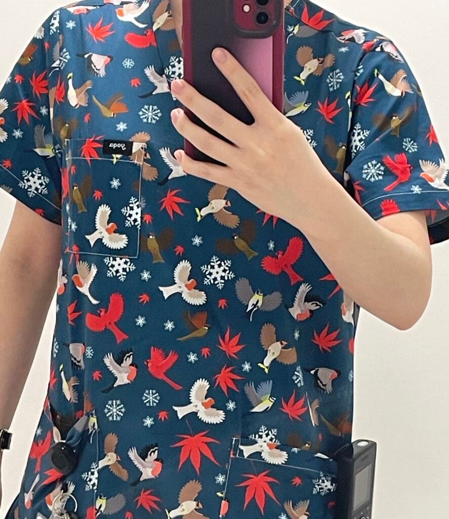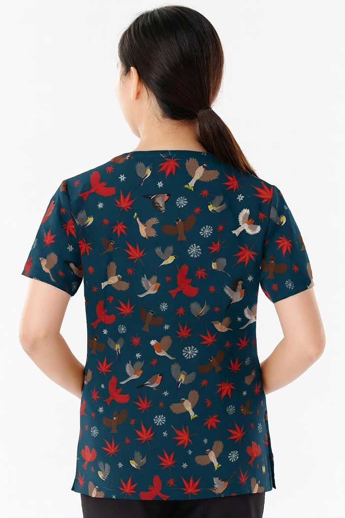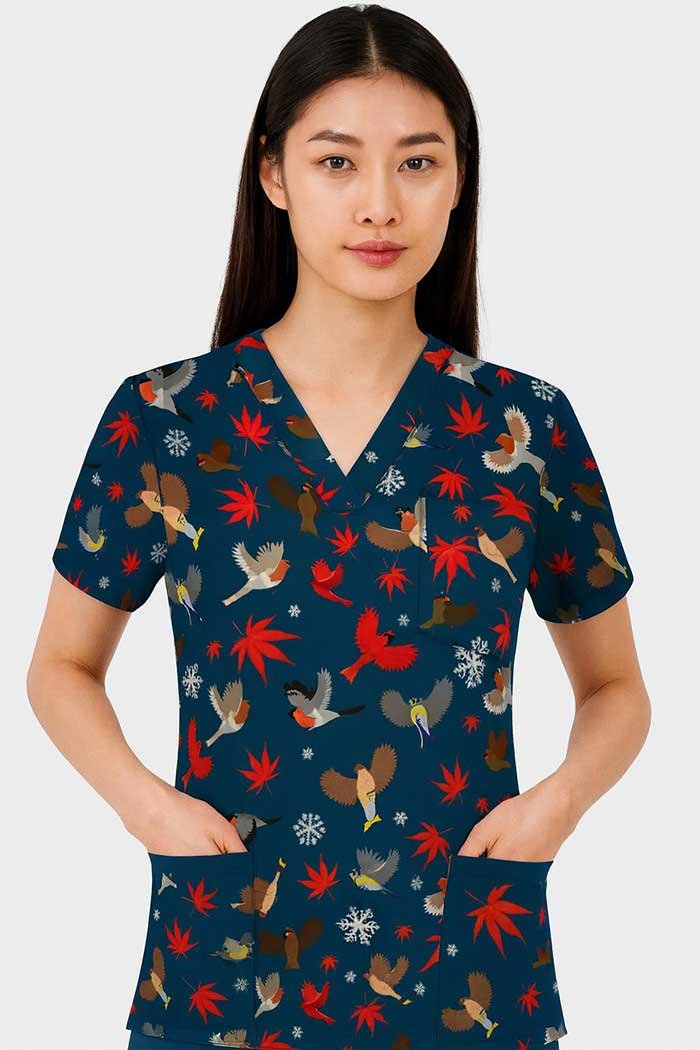 Seasonal scrub top with migratory bird, red maple leaf, and snowflake print. Crafted from 100% cotton with a comfy V-neck and chest pocket. Breathable and beautiful – perfect for clinic & hospital work.
