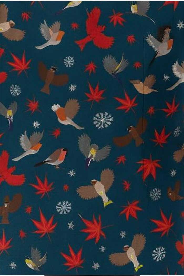 🕊️ Vibrant bird & snowflake print with red autumn leaves