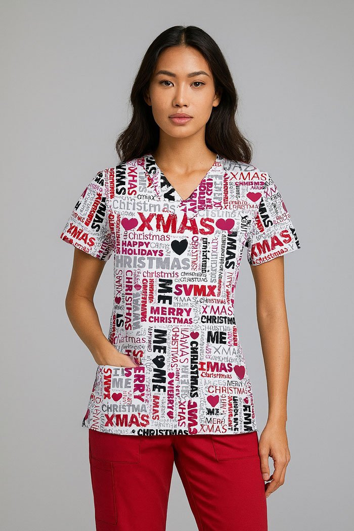 Pair it with navy, black, or beige scrub pants for a cheerful and professional holiday look!