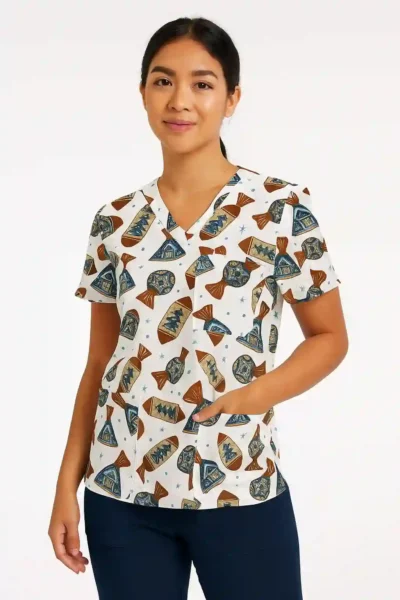 Designed for both men and women, this V-neck festive scrub top features a fun and colorful holiday treat pattern with wrapped candies and gifts — perfect for spreading Christmas cheer at work.