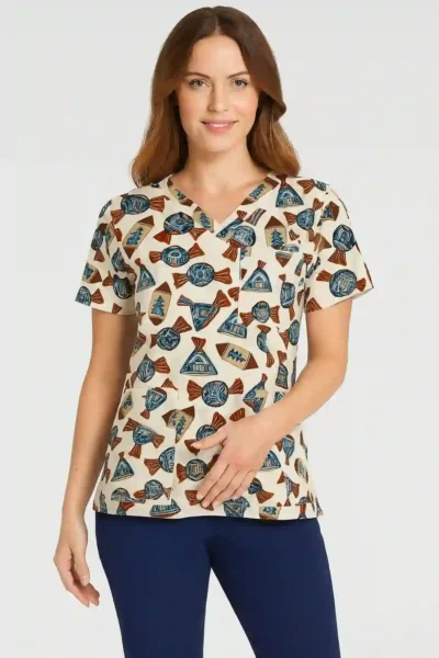 Celebrate the sweetest season in style with our Christmas Treat Print Scrub Top!